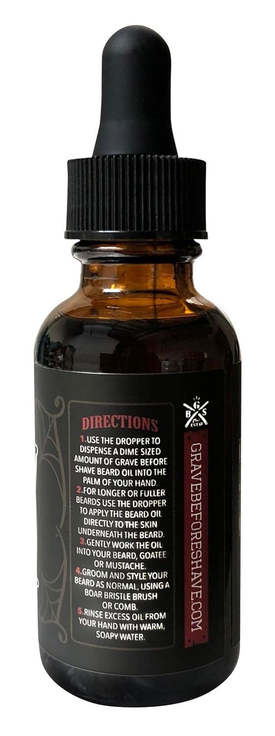 Use the dropper to dispense a dime sized amount of Grave Before Shave Beard Oil into the palm of your hand. For longer or fuller Beards use the dropper to apply the Beard Oil directly to the skin underneath the Beard. Gently work the oil into your beard, goatee or mustache. Groom and style your beard as normal, using a boar bristle brush or comb. Rinse excess oil from your hand with warm, soapy water.
